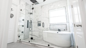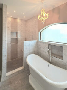 scope of work: Full bathroom and closet renovation including selective demolition, plumbing and fixture upgrades, installation of large-format marble tile, custom mosaic accent panel, shower door and enclosure installation, freestanding tub placement, lighting upgrades, niche construction, closet improvements, and final finish-out.